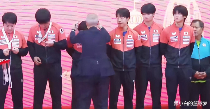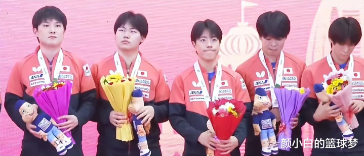张本智和是这支日本男团的领袖,他在颁奖典礼上是一脸的不甘心,刚刚上台时张本智和全程黑脸,只有在收到主办方的玩偶礼品时他的嘴角才有一丝的上扬,或许对于他来说拿到这个玩偶比拿到这块铜牌更值得喜悦吧。