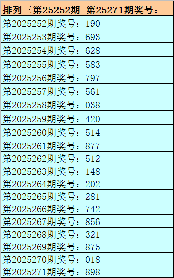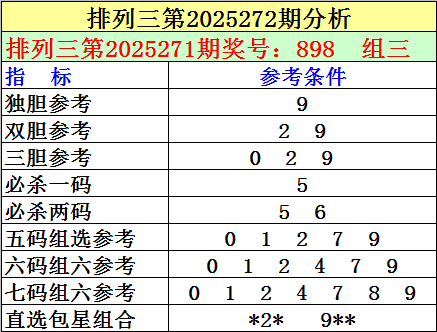 开奖回顾:排列三第2025271期开出奖号:898。其中奖号大小比为3:0,奇偶比为1:2,012路比为1:0:2,和值为25,跨度为1。