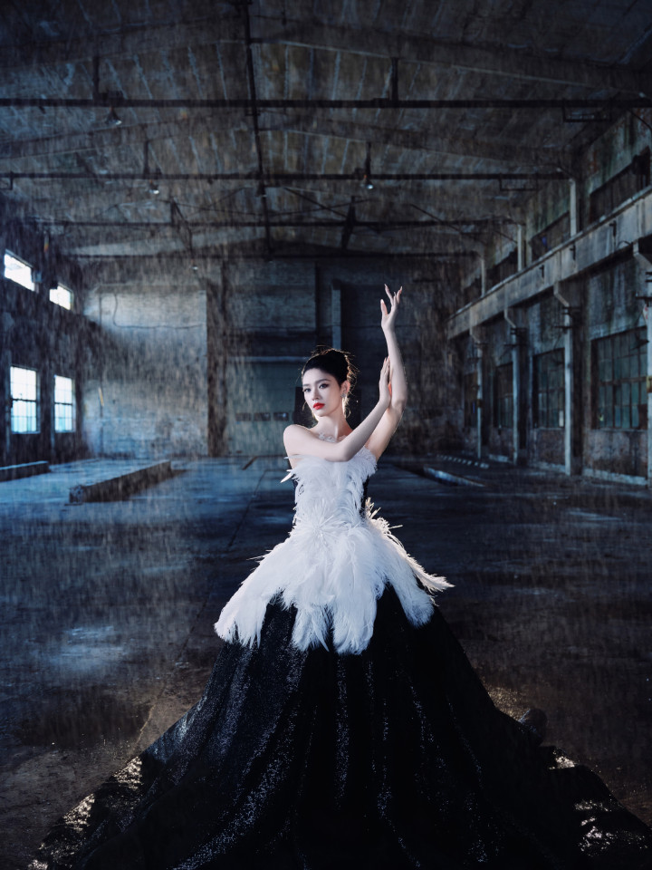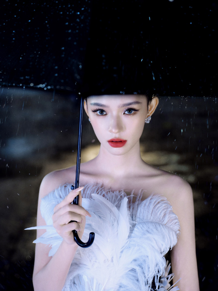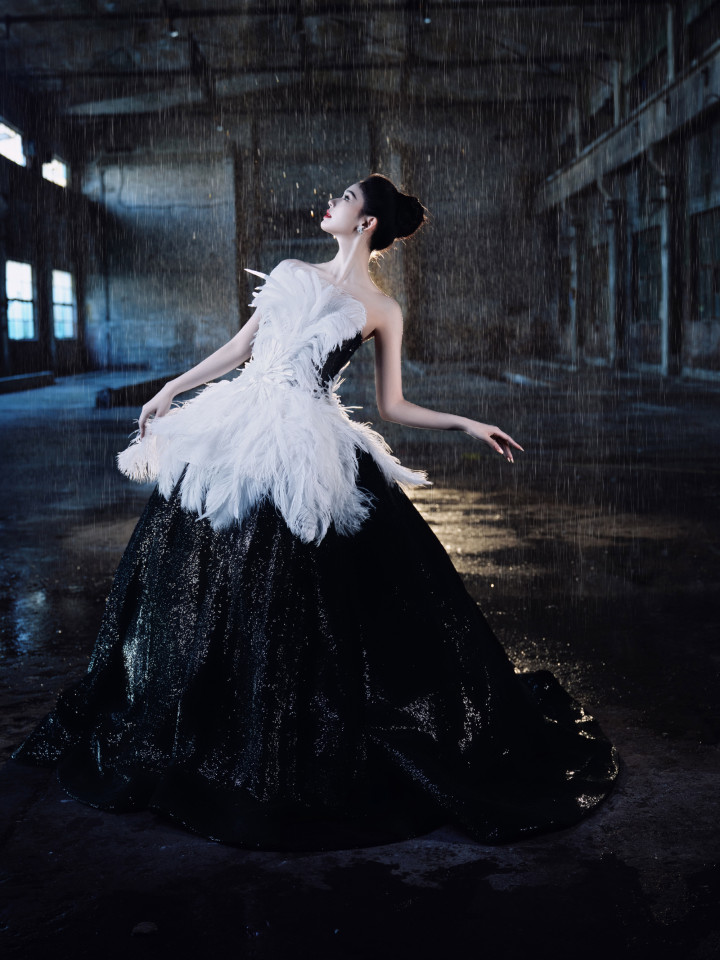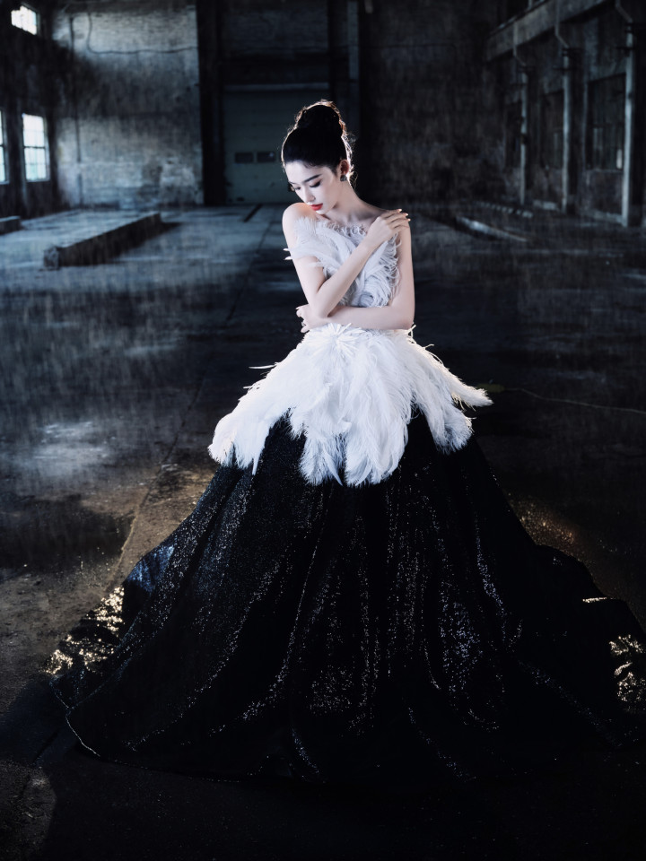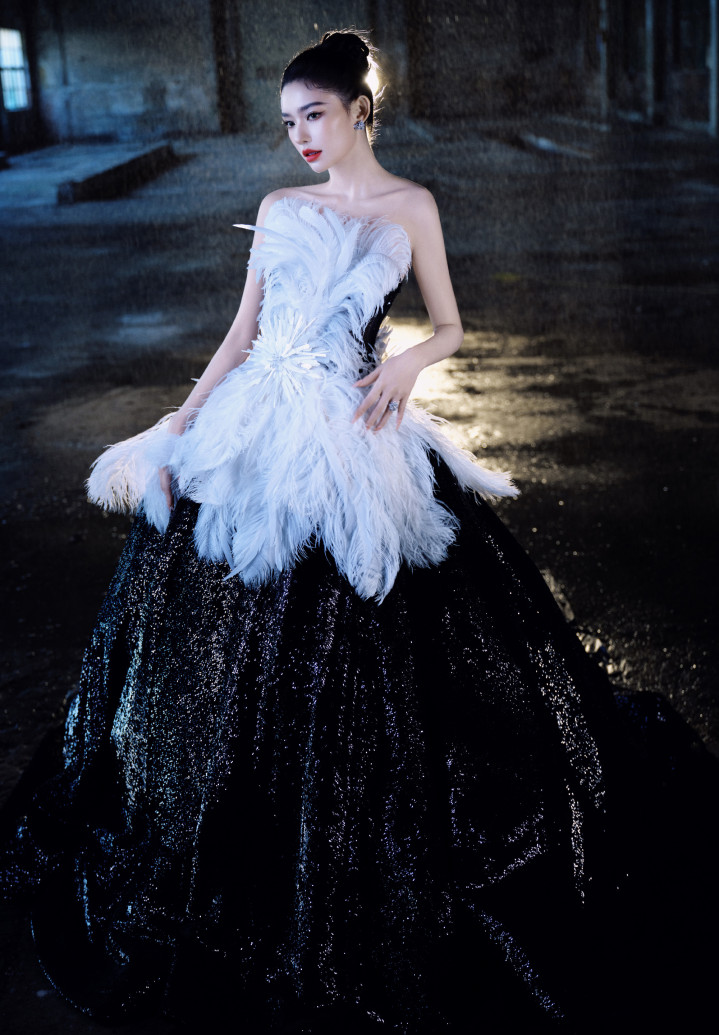而林允这身黑白相间的羽毛裙就显得飘逸和贵气很多了。