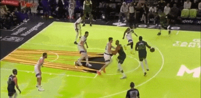 落阵地后 兰德尔在罚球线持球 看到强侧有人协防 立马给到爱德华兹