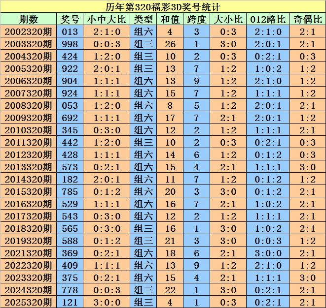 开奖回顾:福彩3D第2025320期奖号为:121。