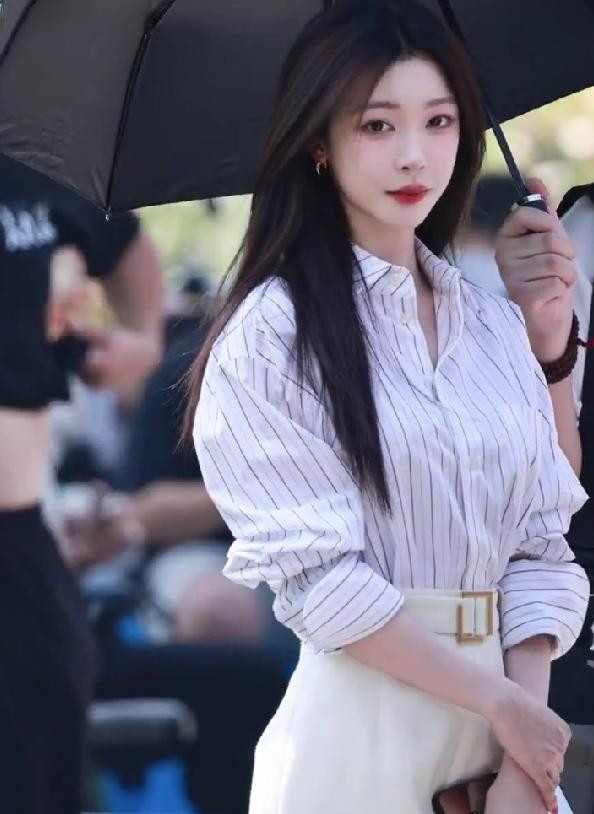 同一种颜色,在不同人身上呈现的效果也不一样。如果说易梦玲穿着蓝色条纹衬衫高智感拉满,那么李一桐的蓝色上衣就很温柔甜美。
