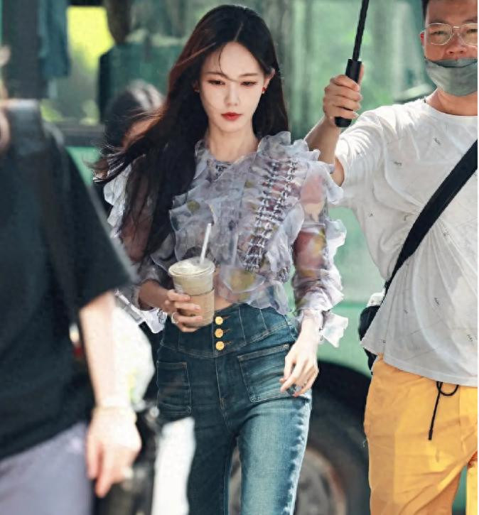 感觉设计感上衣和牛仔裤的搭配似乎成了今年现代剧的主流审美,卢昱晓在新剧《折月亮》中也有类似的造型,估计会成为很多小姐姐的穿搭模板。