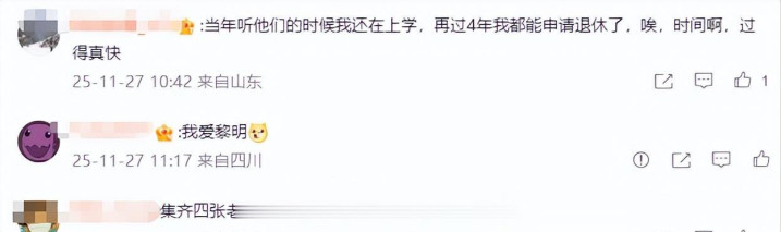 有网友感叹到“时间真是一去不复返啊,没想到我的偶像们都到了要领老年卡的时候了”。