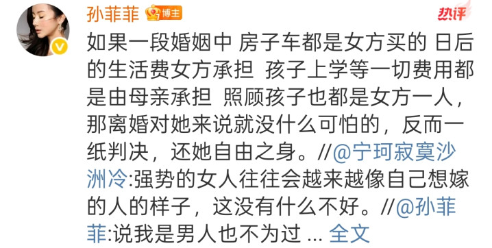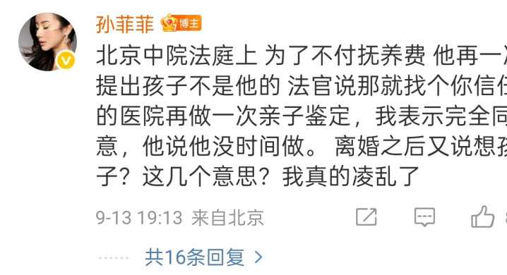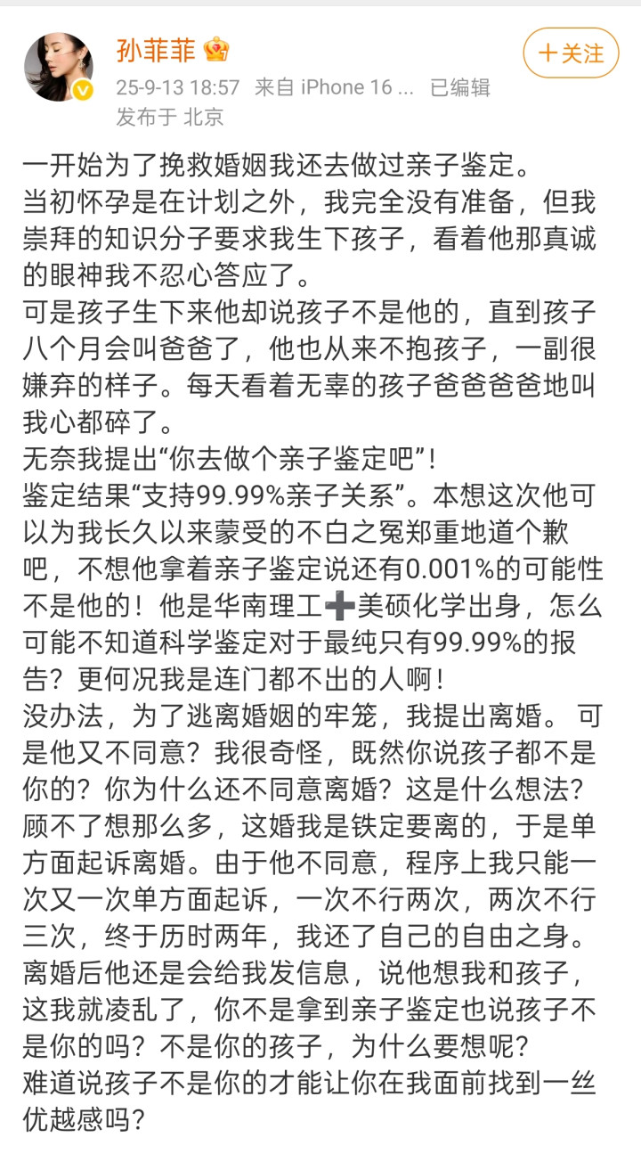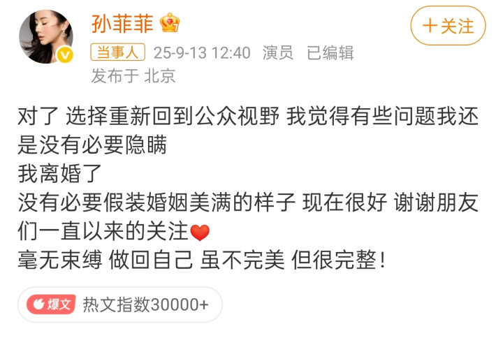 9月13日,43岁女演员孙菲菲突然发文称自己已经离婚了,本不想暴露隐私,但作为公众人物且已经复出重回娱乐圈的女演员,离婚这件事也已经没有隐瞒的必要了。