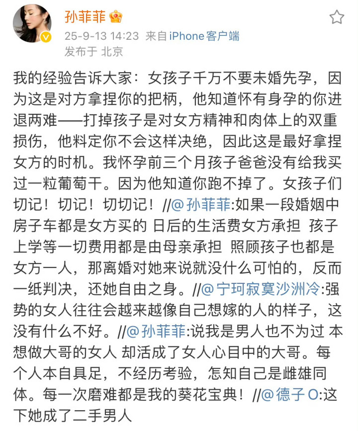 孙菲菲还劝诫广大女性朋友,一定不要未婚先孕,因为未婚先孕就是给男方送把柄,送软肋,如果这个男人不靠谱的话,结不结婚自己都会受到伤害。