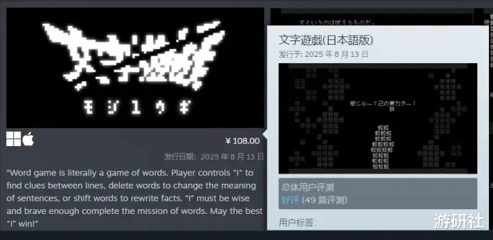 在《文字游戏》日语版正式发售的那一天,黄政凯还遇到了一点意想不到的小插曲:本来应该与NS版同步上线的Steam版,却因为没有通过Valve的审核,无法顺利发售。